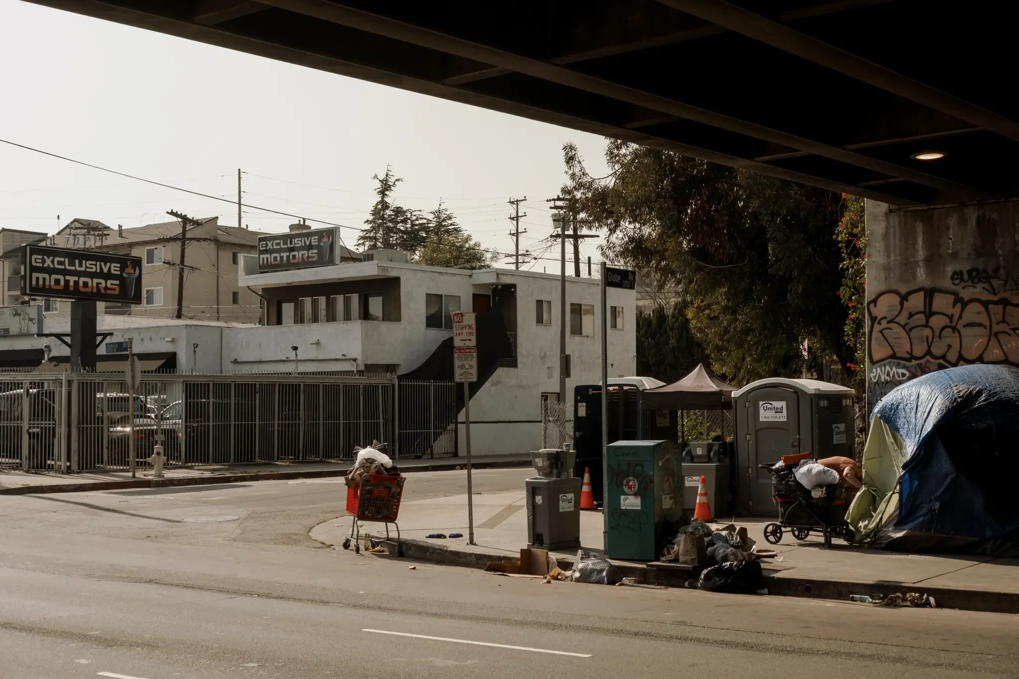 But that was before a homeless encampment took up residence across the street. Now, instead of luxury vehicles, trash and approximately two dozen tents line both sides of the formerly busy thoroughfare, scaring away any hope of new business.
