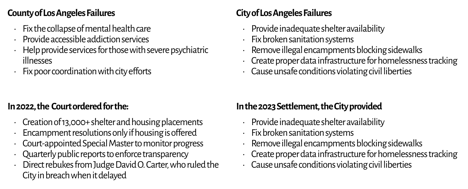 The goal of the lawsuit was to target the failure across every level of government. And it brought to light the failures of the County and City of Los Angeles.